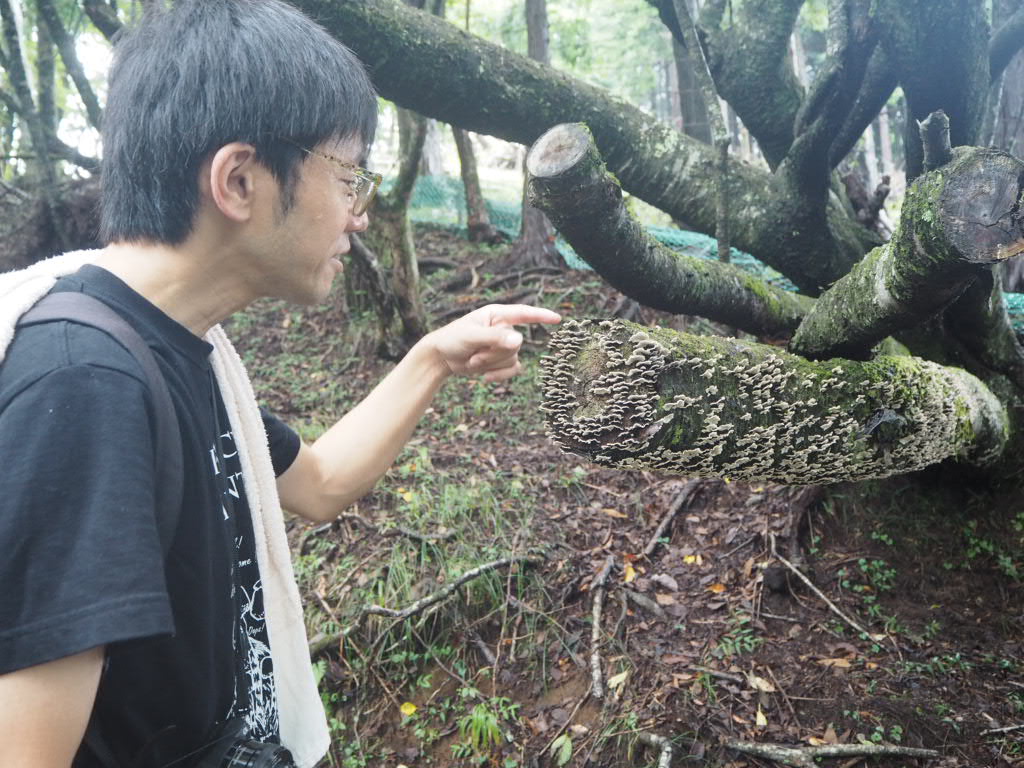 露木さんの話に引きこまれるうちに「これはカワラタケですね」とついにキノコ発見!木にびっしり群生する、キノコの迫力に見入る記者に「ここまで広がると、まもなく木が分解されるでしょうね」と教えてくれました。