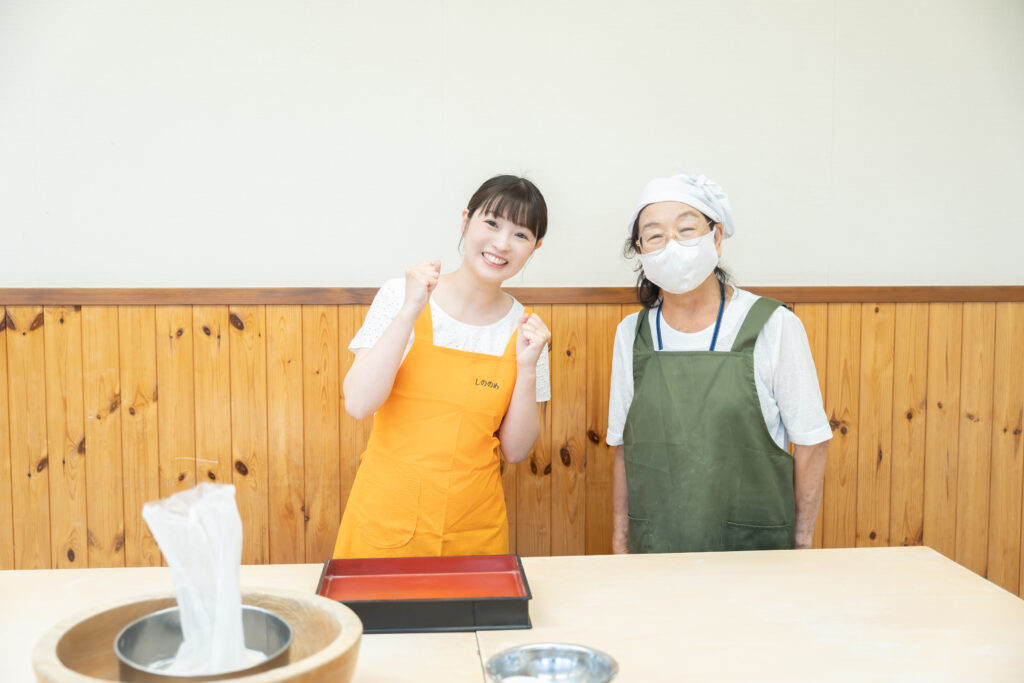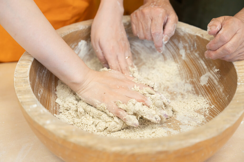 代表の山田さんにそば打ち体験のおすすめポイントを改めて伺ったところ、「やっぱり、自分で打った『三たてのそば』が食べられるところですね。三たてとは、『挽きたて、打ちたて、茹でたて』のことで、おいしいおそばの条件とも言われるんです」とのお言葉が。