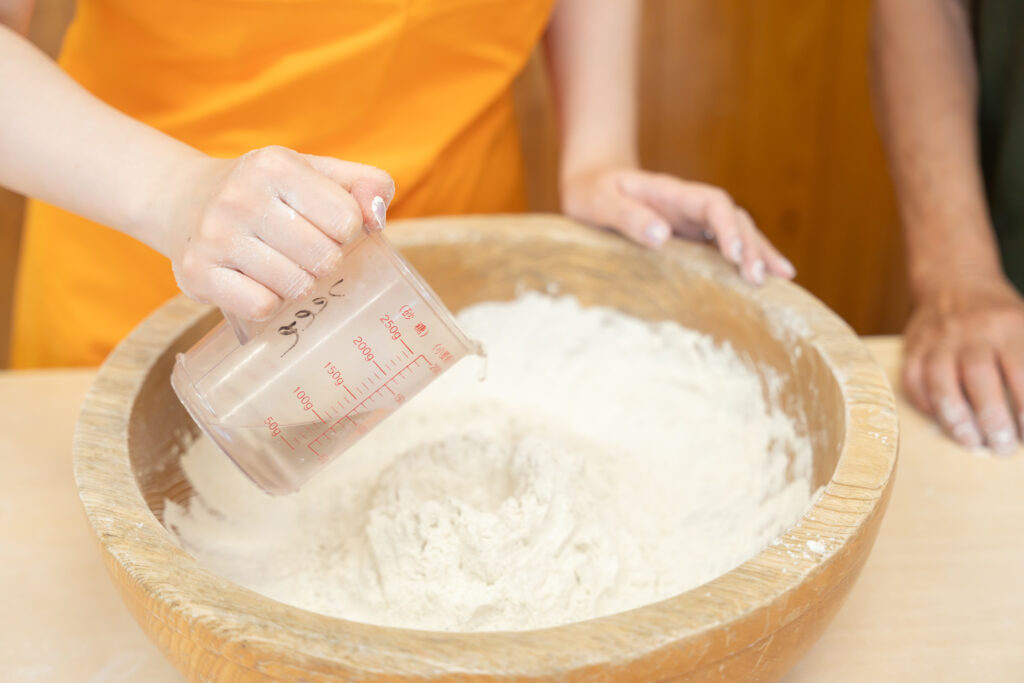 熱湯を入れた後はひたすらにこねていきます。サラサラしていた粉が、だんだんとモロモロしてきたのがわかりますよね!指についた粉も払いながら均等に混ぜ合わせていきます。