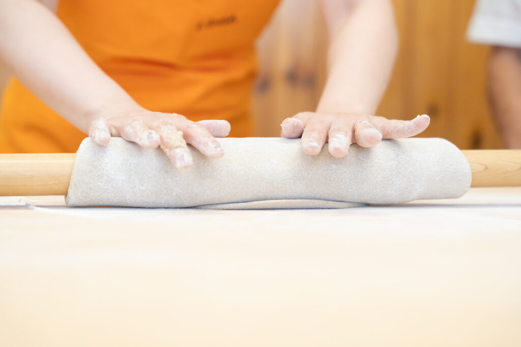 四方が50㎝くらいになってきたら、今度は麺棒に巻きつけ転がすようにして、さらに生地をのしていきます。生地を麺棒に巻いたまま押し転がし、ある程度転がしたら麺棒を身体に向かって手前にひくのですが、ここでしっかり麺棒を押しつけたままひっぱることで、より生地が伸びるそうです。