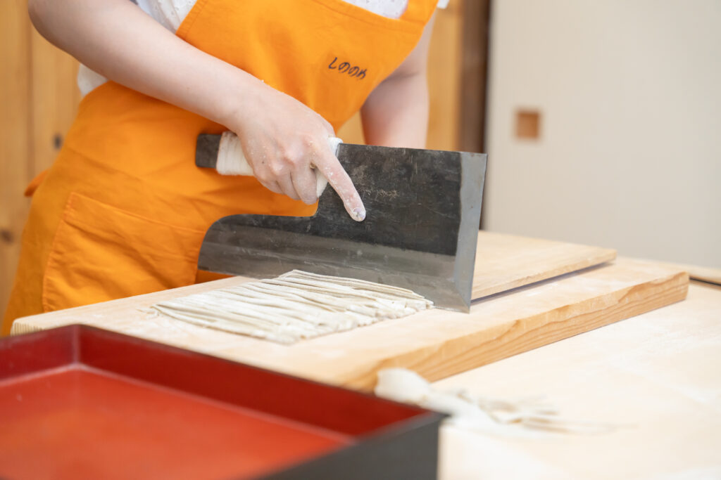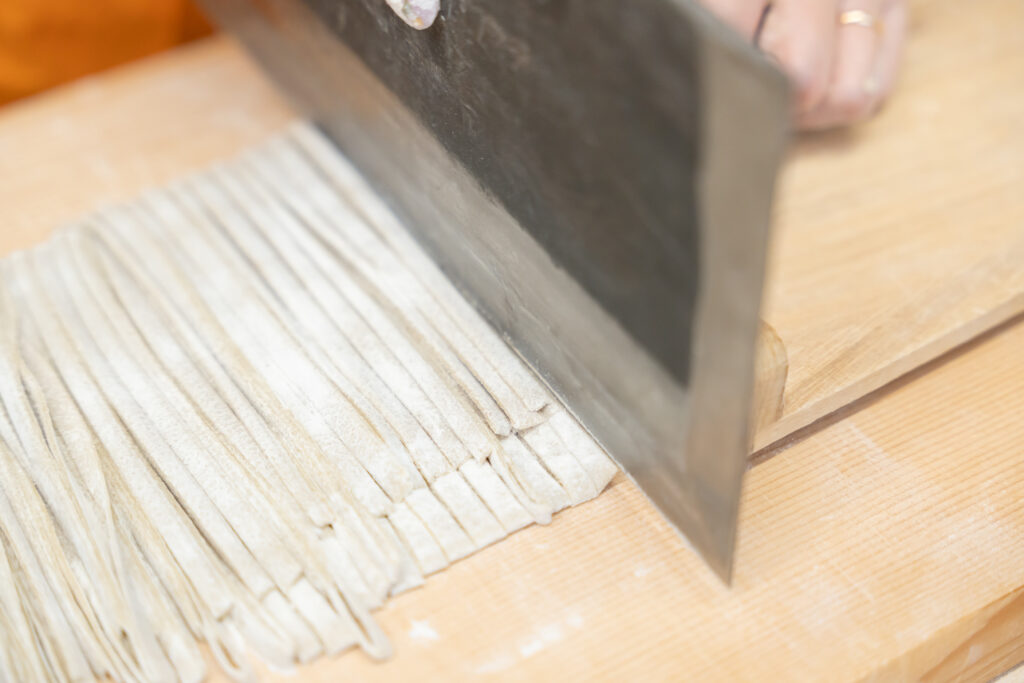 そばの生地はとても柔らかく、下までしっかり刃をおろしたつもりでも、最後まで切れていないことも。最初の方に切っていたそばは繋がってしまっていました…。気を取り直して、幅も揃うように丁寧に切っていきます。