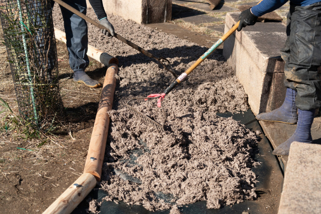 完全に固まるには二週間ほどかかりますが、この日は天気も良く、高台にある園地には陽がよく届いて乾きやすいそうで、作業員の皆さんが手早く作業されていたのが印象的でした。