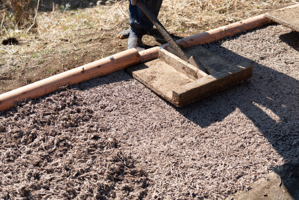 まずは、レーキ(熊手)でウッドチップを素早くならしていきます。作業員の方から、「固める前のこの時点で、目で見てもまっすぐ水平にならすことが、きれいに仕上げるコツです」と教えていただきました。