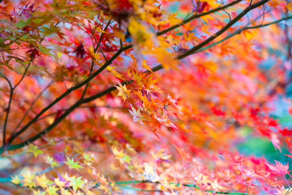 石庄庵のテラス席から見える、見事な紅葉。この美しい景色が味わえるのも魅力の一部です