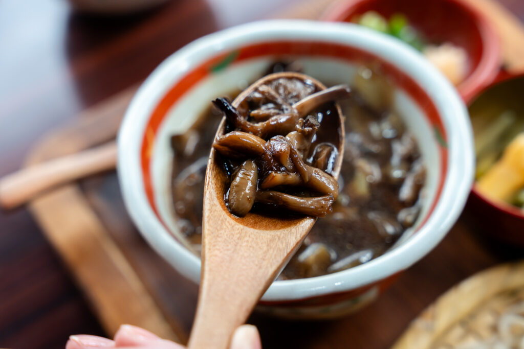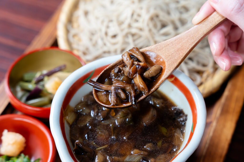 レンゲいっぱいのきのこを頬張ると、じんわりと深い旨味が広がりました。何より、コリコリとした噛み応え!噛むたびに滋養が身体に染み渡るような気がします。また特有のぬめりがあることでよく絡み、そばのコシとあわさってつけ汁の味もしっかりと堪能できました。山の旨味が直接伝わってくるかのような力強い味わいで、この蕎麦を目的に多くの観光客が訪れるのも頷けます。