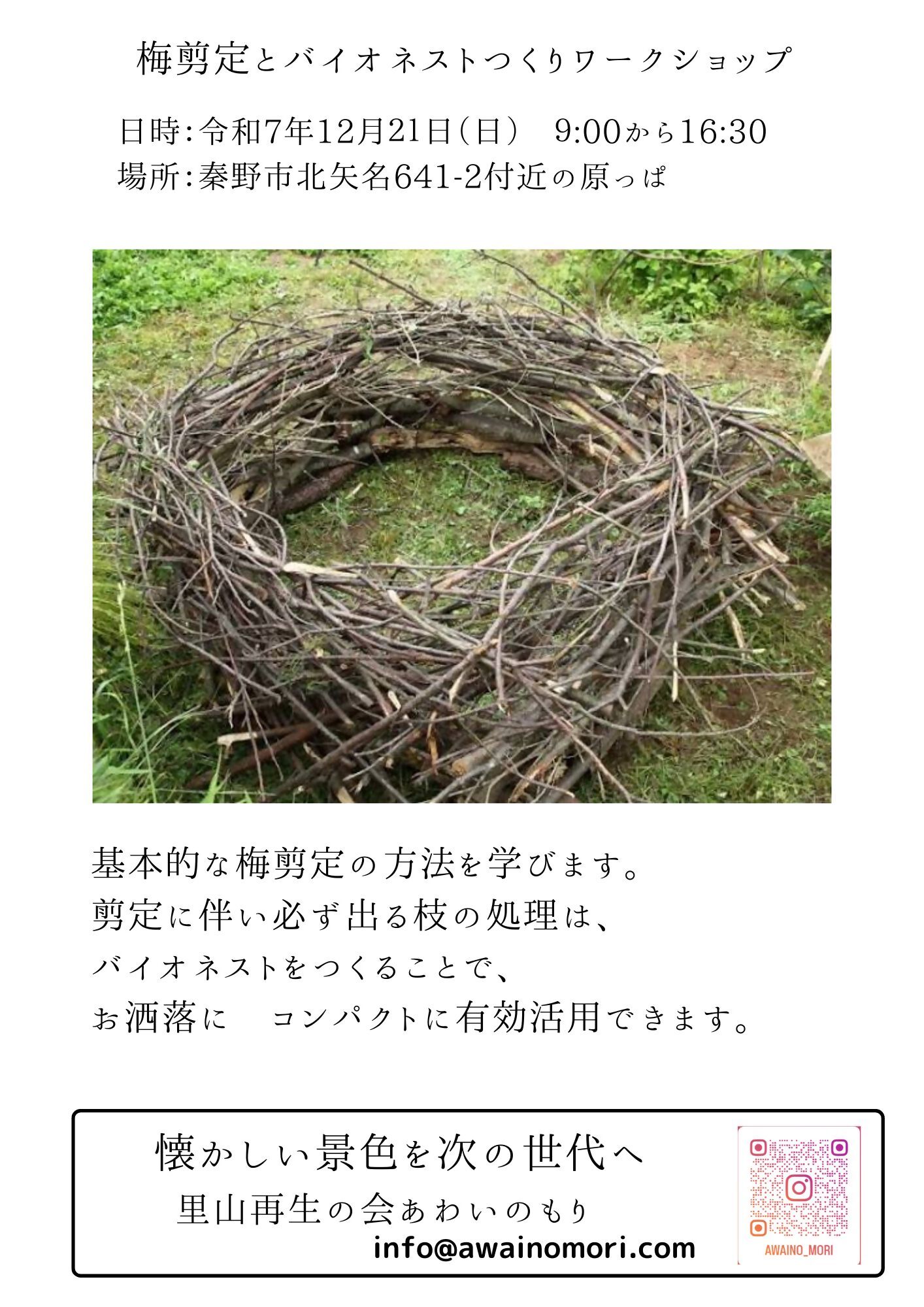 あるいはHP、Instagramのダイレクトメールに「梅剪定とバイオネストつくりWS参加希望」とタイトルをつけてお申込みください。
