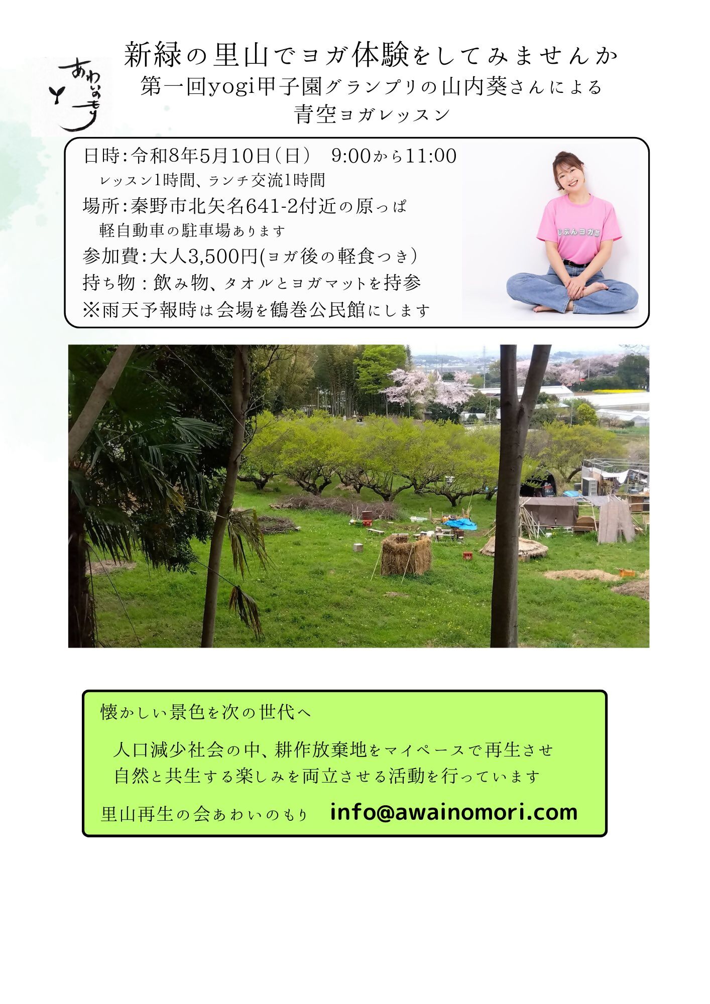 あるいはHPインスタのダイレクトメールに「里山ヨガ体験参加希望」とタイトルをつけてお申込みください。
