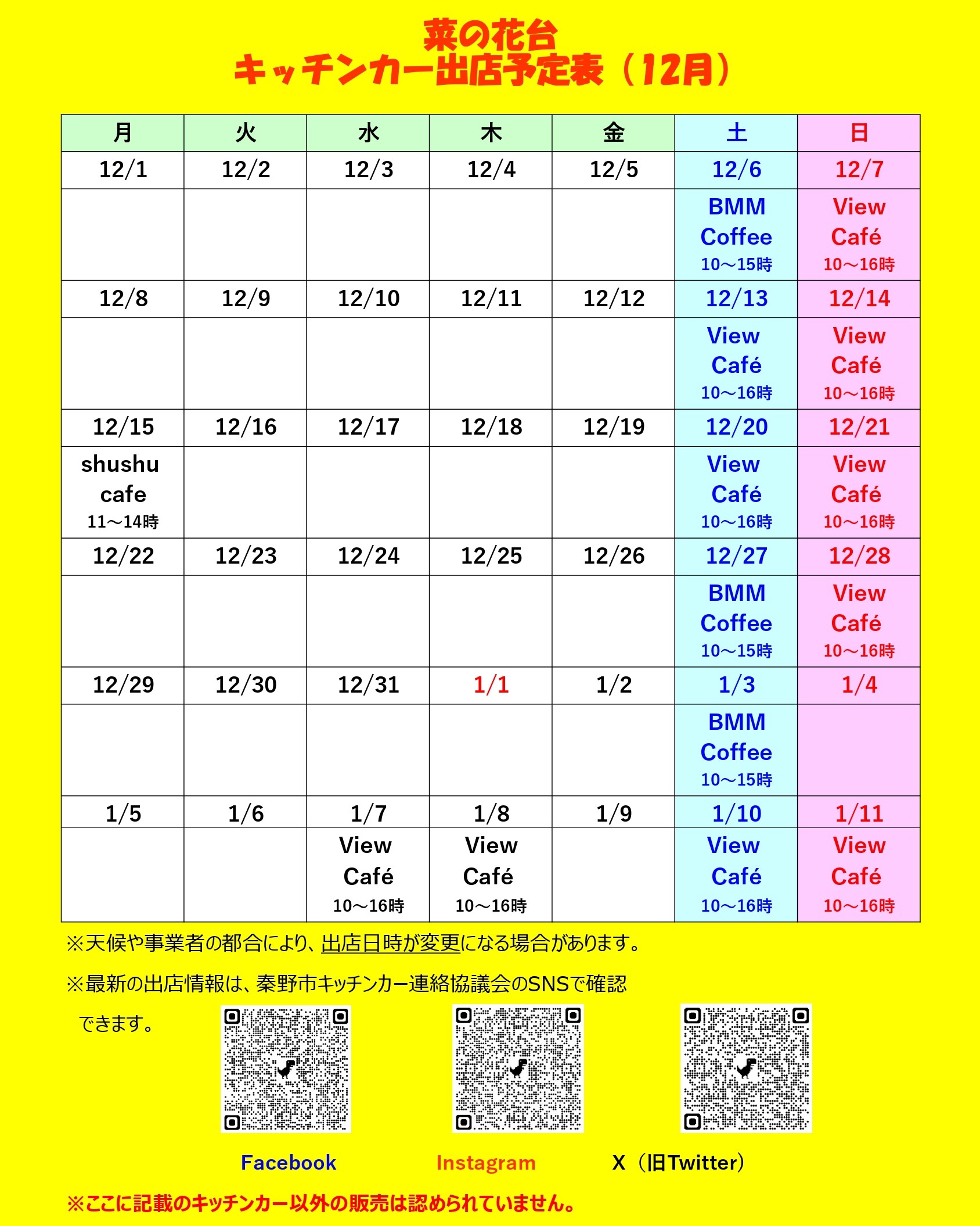 12月のキッチンカーの出店予定ができましたので、お知らせします。