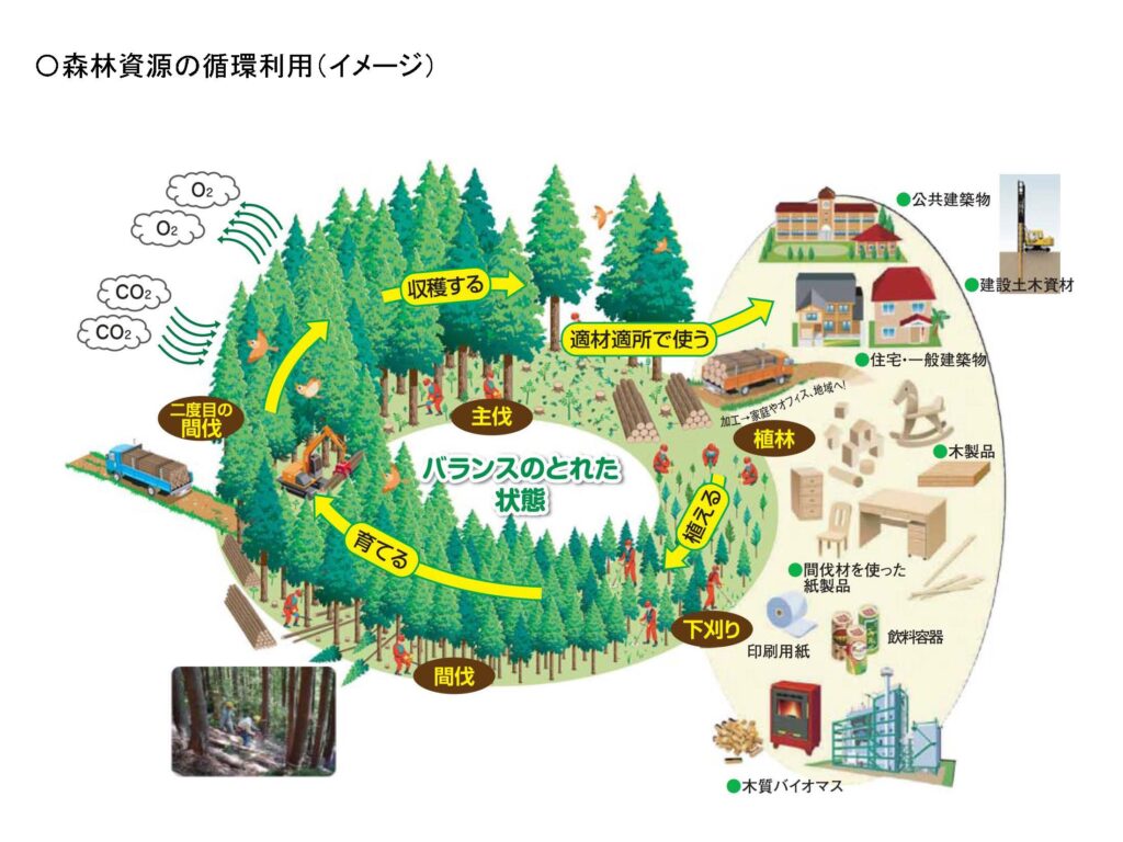 森林の循環サイクルとは「木を植えて、育て、資源として活用し、再び木を植える」という一連の活動が回ることで、森林が健康で持続可能に機能する仕組みのことです。