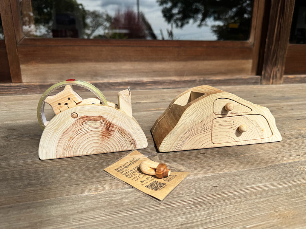 丸太の木目・形を活かしたテープカッター、小物入れ、どんぐりの笛