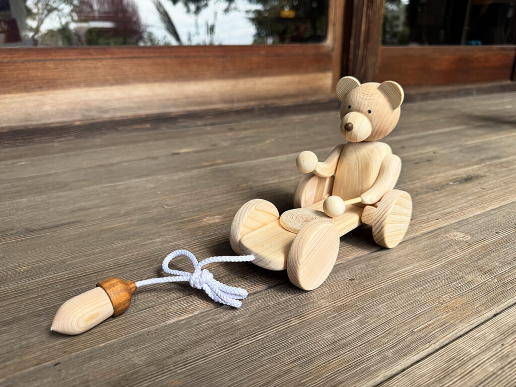 あしがら丸太細工の「ドラムベア」(どんぐりを引っ張ると熊がドラムを叩きます)