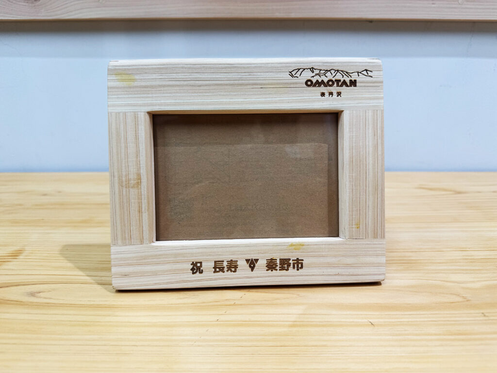 秦野市の「木のある暮らしづくり事業」で敬老祝いに贈られるフォトフレームは、小島さんの作品です。上部の木肌にはあえて凹凸を残し、表丹沢の稜線をイメージしています。一つとして同じものはなく、それぞれの木が持つ表情が楽しめます。